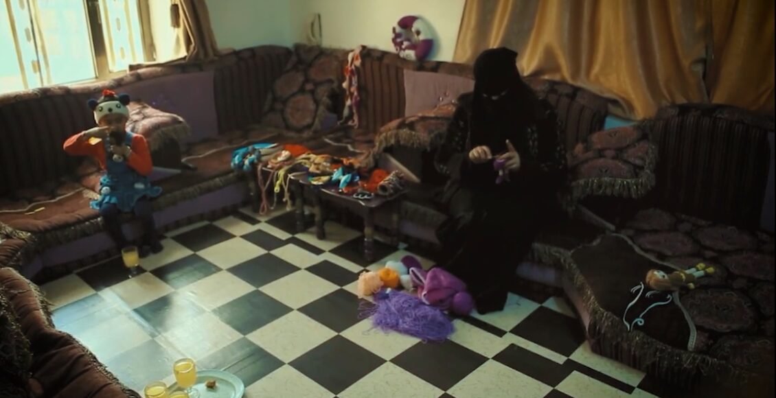 في الصورة تظهر وهي تمارس مهنة أخرى غير الصحافة. بسبب الحرب انتقلت إلى صنعاء للعيش فيها. افتتحت مشروعًا خاصًا بها وهو حياكة الدمى. لا يحتاج هذا المشروع إلى ميزانية مالية ولا إلى استئجار مقر أو استخراج ترخيص. تعمل من المنزل أحيانًا، ومن “حديقة الثورة” في أحايين كثيرة. تترك ابنتها تنشغل بالألعاب، فيما تنشغل هي بحياكة الدمى، ويقوم زوجها في توزيعها للعملاء.