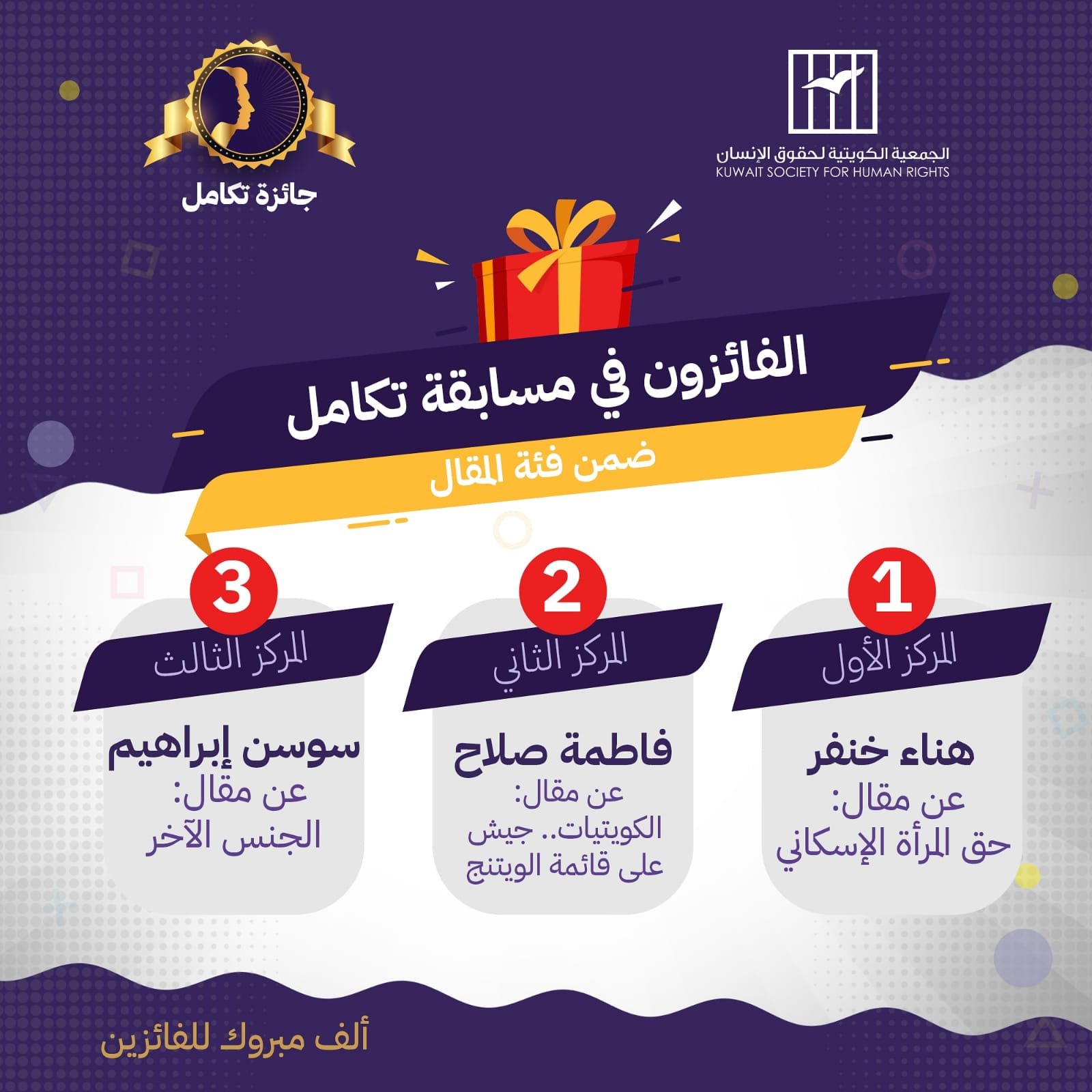 الجمعية أعلنت أسماء الفائزين في المسابقة بالتزامن مع مناسبة اليوم العالمي للمرأة. قالت إنها تسعى لتحقيق مفهوم المساواة بين الجنسين عبر حشد الطاقات الإعلامية لتسليط الضوء على قضايا المرأة في الكويت.